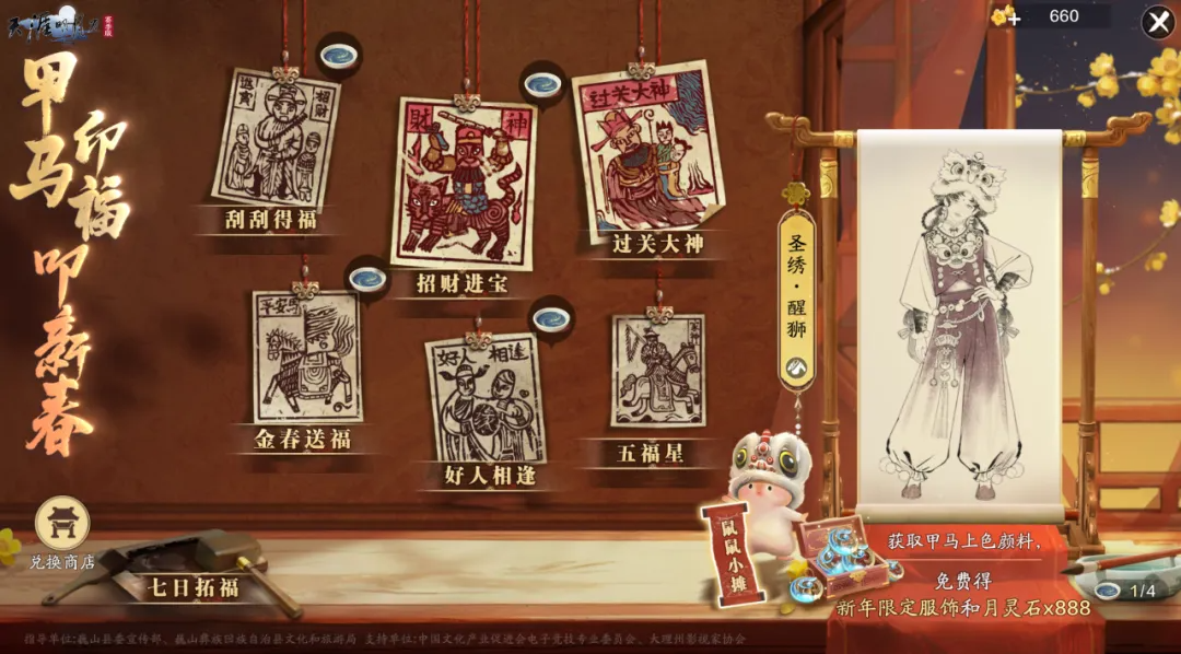 小年到,江湖喜乐不停歇!S5《承锋》赛季携新玩法、新外观、新活动现已登场,更多内容点击此处前往查看>>丙午马年新春将至,新春版本携甲马非遗联动重磅接档而来,在收获满满新春好礼的同时,了解甲马非遗的魅力! 天涯明月刀手游×巍山甲马文化联动新春活动【甲马印福叩新春】明日正式登场!马年新春与非遗邂逅,福利与雅韵双收,参与可得普赠外观【圣绣·醒狮】、3000+月灵石、随心染匣等海量好礼! 明日第一天,主界面-【甲马印福叩新春】活动中就有下面这些奖励可以轻松获取,少侠不要错过啦~ 天衣礼券、玲珑染匣——七日拓福 耳饰【听情·喜柿】、问影晶石、绘彩宝匣等道具——刮刮得福 头饰【吾爱·高头马】、月灵石、玲珑染匣——招财进宝 兑换道具【蜡梅】、【甲马颜料】——过关大神 还可使用新春专属兑换道具【蜡梅】在兑换商店中获取新春红包封面、精致外显、玲珑染匣、神品璞玉宝匣等奖励! 甲马印福叩新春 天涯明月刀手游×巍山甲马文化联动活动【甲马印福叩新春】由巍山县委宣传部、巍山彝族回族自治县文化和旅游局指导,中国文化产业促进会电子竞技专业委员会、大理州影视家协会支持。 明日起,少侠可前往游戏内【甲马印福叩新春】入口参与新春系列活动,了解甲马文化的历史渊源与制作工艺,感受传统非遗的魅力,更能领取超多新春好礼! *研发中效果展示,具体功能以游戏内为准 普赠外观【圣绣·醒狮】 参与新春系列活动可获取甲马上色颜料,集齐四个即可免费兑换月灵石与新年限定普赠外观【圣绣·醒狮】,祝少侠新春大吉,马年顺遂! 醒狮腾霄,鼓震山河。锦披星霜,足踏云涛。 七日拓福 轻松一点,好礼天天领!明日起,少侠可前往活动页面参与【七日拓福】,从认识甄选梨木良材开始,逐步了解甲马纸的制作工艺,更能收获月灵石、新春限定外显、天衣礼券等丰富奖励。 *研发中效果展示,具体功能以游戏内为准 甲马印福 少侠快来收好新春祝福啦!明日起,在活动页面参与【过关大神】【招财进宝】【好人相逢】等甲马印福主题系列活动,不仅能真切体味甲马作品的艺术表现力,收获美好祝福与寓意,更能获得头饰【吾爱·高头马】、头饰【吾爱·夜行聆】、耳饰【听情·喜柿】、背饰【腊味年香】、月灵石、玲珑染匣等海量好礼! 吾爱·高头马 *受平台上传限制画面严重压缩游戏内效果更佳 吾爱·夜行聆 *受平台上传限制画面严重压缩游戏内效果更佳 听情·喜柿 *受平台上传限制画面严重压缩游戏内效果更佳 腊味年香 *受平台上传限制画面严重压缩游戏内效果更佳 听情·素瓷驹 2月13日起,还能体验新春剧情,领小马耳饰【听情·素瓷驹】,并有机会在每日19:34随机成为福星,领海量金叶子、问影晶石、玲珑染匣好礼,少侠吸吸欧气还能必定获得奖励哦~ *受平台上传限制画面严重压缩游戏内效果更佳 兑换商店 新春兑换商店也将在明日开门接客啦!点击【甲马印福叩新春】活动页面左下角【兑换商店】即可进入,使用少侠在活动中获得的新春专属道具【蜡梅】即可兑换新春红包封面、精致外显、玲珑染匣、神品璞玉宝匣等奖励! *研发中效果展示,具体功能以游戏内为准 鼠鼠小摊 鼠鼠小摊限时出摊,新春新品迎新送福!闪光小马糖画配饰【灵殊·画骄岁】随新春活动同步登场,通过活动页面【鼠鼠小摊】即可获取,少侠还可通过“暴涨”提升优惠金额,以超低数量月灵石带回家~ 灵殊·画骄岁 *受平台上传限制画面严重压缩游戏内效果更佳 甲马纸的“身世” 承载悠久历史、极强的艺术表现力的甲马纸木板刻画,在不同地区拥有不同的姓名,我国北方称之为“神马”,江浙沪一带称之为“纸马”,在云南被称为“甲马”、“甲马纸”等,在云南巍山一般俗称为“马子”。 它是中国民间祈福禳灾活动时所用的各种手工雕版印刷品的总称,因所印图案多披甲骑马而得名。其起源可追溯至唐代,历经千年传承,至今仍在民间生生不息,是承载民俗信仰的重要文化载体。 图片摄影来自:杨海涛 甲马纸的“表达” 在传统民俗中,祈愿者会将自己的美好心愿寄托在甲马纸上,并对其进行张贴或焚化,期盼万事顺遂,达成所求所愿。 图片摄影来自:杨海涛 巍山甲马纸采用传统木版刻画技艺,印刷图案丰富多彩,涵盖人物角色、飞禽走兽、自然山川等题材,视觉朴拙厚重、图案活泼大胆,是极其珍贵的民间美术遗产。2005年,它被列入巍山彝族回族自治县首批县级非物质文化遗产保护名录。 图片摄影来自:杨海涛 并且随着时光长河的延续,如今的甲马图案中也融入了更多“时兴”的内容,大家热议和关注的IP与人物、猫猫等宠物相关的美好祈愿都被生动地融入到了这一文化当中。 图片摄影来自:杨海涛 甲马纸的制作 少侠们通过新春活动【七日拓福】,即可大致“学习掌握”到甲马纸的制作工艺。首先需要甄选质密纹匀的梨木良材,将已经勾勒绘制好的纹样团反贴在木板上,严格按照画稿轮廓进行雕刻。 图片摄影来自:杨海涛 刻好之后,在雕版上刷上墨,用红、绿、黄等颜色的纸张进行拓印。也可在拓印完毕的作品上手工上色,着以敷彩点睛之笔。 春日昭昭 2月12日,全新春日主题外观【春日昭昭】将随新一期【霓光奇珍】活动来到江湖,收藏外观同步解锁耳饰【听情·春日昭昭】与动作【探春芳】。 外观故事 南郊缓辔,花气如酿。旧游忽至,韶