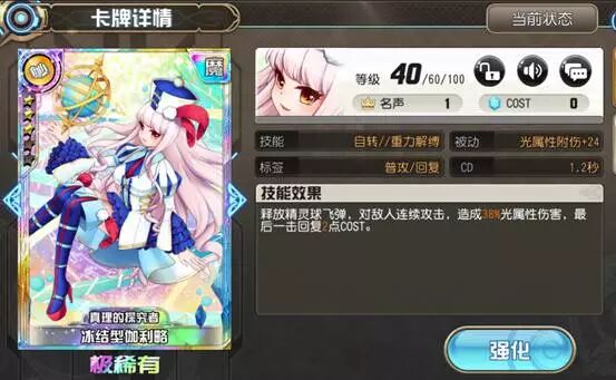 卡牌的等级以及消耗都显示在右上角,等级通过喂养经验狗粮提升,名声则是需要同名卡牌才可以提升