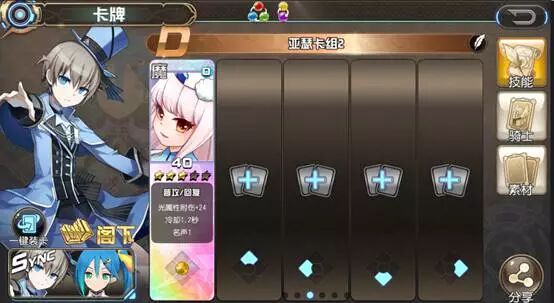 首先进入我们【 卡牌 】的界面 我们可以发现有五个卡槽,即一个卡组可以携带五张卡 卡牌又分五种 属性 ,分别为火、冰、风、光、暗