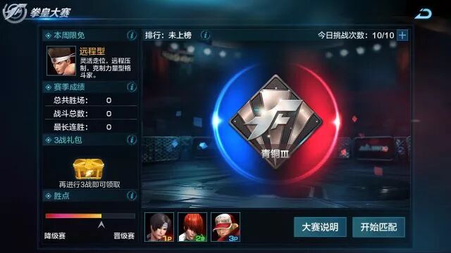 拳皇大赛采用经典的拳皇3VS3赛制,可以使用3名格斗家依次进行比赛。在拳皇大赛中,胜场越多,越接近晋级赛;负场越多,越接近降级赛,也就是说,胜利会使胜点增加,失败会使胜点下降。胜点满时,处罚晋级赛,胜点为零时,触发降级赛。