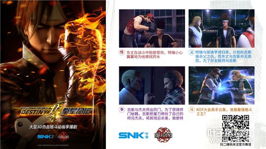 正版拳皇系列长篇动画片《拳皇命运》将于2017年夏上映,这部大型3D热血格斗动画季播剧的创作背景、画面、配音、上映平台等相关信息也将在发布会公布。