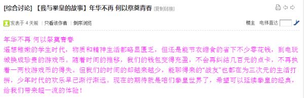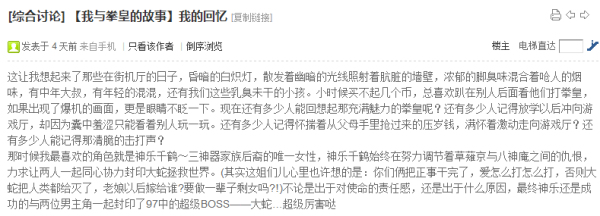 尊敬的FIGHTERS: 哦哈哟~!我是小舞,每周五小舞都会为大家带来《每周一拳》栏目: 每周一拳:《拳皇世界》每周资讯资讯、产品爆料、好玩趣图、最新动态,一应俱“拳”。 本周小舞带来了满满的干货,希望可以帮助各位格斗家更多的了解《拳皇世界》手游。 巨大世界 在《拳皇世界》中,拳皇系列诸多经典场景将被完美还原,各位格斗家既可以在游戏中约会泡妹、相互切磋;也可以和建筑及载具进行互动,比如进入酒吧娱乐、乘坐出租车等,体验真正的拳皇大世界。 酷炫造型 《拳皇世界》所有人物都是采用3D建模,从模型截图上可以看出,人物造型和拳皇14更为贴近,当然这里指的是默认造型。据小舞所知,历代拳皇系列出现的人物造型在《拳皇世界》中都有可能会出现哦~ 作为拳皇系列人气最高的角色之一,八神庵一直以冷酷的造型,凶悍的出招吸引了无数粉丝。他另类的着装以及酷酷的动作已经成为无数年轻人模仿的对象,八神庵早已不是简单的一个动漫人物,他是一种文化,一种时尚。 作为一个富二代公子哥,二阶堂红丸的夜生活相当的丰富,晚上总是能在一些高级餐厅、酒吧夜店里捕捉到他的身影。 都市模拟 《拳皇世界》是一款以高自由度都市模拟为主要特色的手游,大量的都市生活情景都被完美移植到游戏中,比如机车出行、电话约会。 《拳皇世界》机车的种类非常丰富,相信可以满足各种口味的玩家需求。机车由多个部件组装而成,各位格斗家可以通过不同的养护方式来打造自己的专属机车。 在游戏中,玩家会看到那些熟悉的格斗家在各个场景中活动,每个格斗家都被赋予一定的剧情故事,与其他角色进行互动交流。安迪在游戏中就会经常收到不知火舞的来电骚扰,逼婚?约会? 电话是现代都市人最常用的一种远程沟通方式,玩家在《拳皇世界》中扮演的主人公,会经常收到某位格斗家的来电,约你见面,交给你一件委托事件,完成任务还能获取丰厚的奖赏。使得玩家真正的融入到游戏的剧情中去,了解每一个格斗家的故事经历,这就是《拳皇世界》的独特魅力。 玩家留言 《拳皇世界》手游的消息一经放出,便吸引了无数拳皇粉丝的关注。对于这一传承23年的经典格斗游戏,每个人都拥有着自己和拳皇的专属故事。有懵懂年少的格斗新手省吃俭用只为打一把拳皇,有1个币就能玩一下午的超级大神在游戏厅享受着众人膜拜,也有在游戏厅遇见自己的另一半,早早的完成了终身大事的人生赢家。 而你与拳皇的故事又是怎样的?欢迎各位小伙伴告诉小舞哦。 小田泰之 2月9日拳皇系列统括制作人-小田泰之,在微博曝光了一张疑似特瑞?博加德最初的设计手稿,大家一起来感受下 。 虽然只是寥寥的简单几笔,但是小舞已经感受到了一股一飞冲天的气势,你感受到了吗 。。。 温馨提示 下周小舞将有重磅消息公布:关于《拳皇世界》手游,小田泰之大大有话要对大家说哦,不想错过的格斗家一定要记得关注哟~ 拳皇世界类型:平台:状态:安卓版暂无下载苹果版暂无下载 了解更多相关信息,请前往http://news.yzz.cn/ku/kof/ [编辑:犀利摇]
