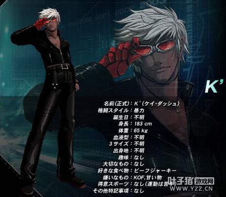 K'资料介绍 这一位冠军选手与草薙京有一点的联系,因为受过草薙京因子的改造获得了操纵火焰的能力。开始听命于NESTS组织,后得知自己的记忆被NESTS组织动过手脚就叛离出去,对NESTS组织进行大规模的报复,在这期间曾多次参与了KOF大赛,次次都取得了骄人的成绩。作为一名小兵,K'仅靠自己的力量就推翻了强大的NESTS组织,在太空基地中击败组织首脑伊格尼斯,可见其实力有多强大。