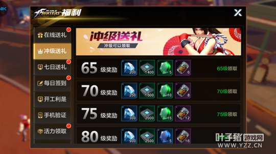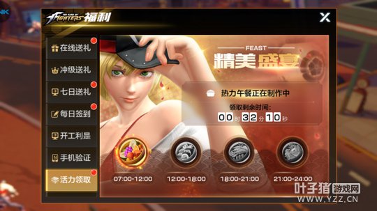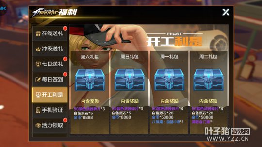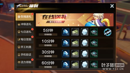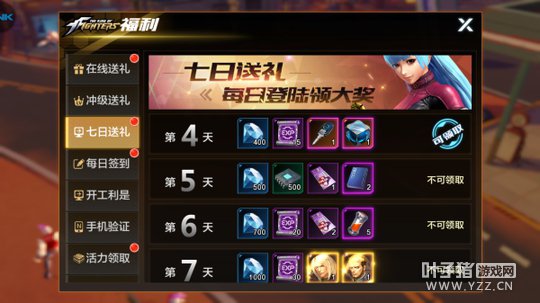 活动四:七日大礼每天领取额外惊喜 测试期间,每天登录游戏均可领取当日奖励,包含蓝钻、草薙京契约、狂暴八神庵契约、S级委托书等丰厚奖励!