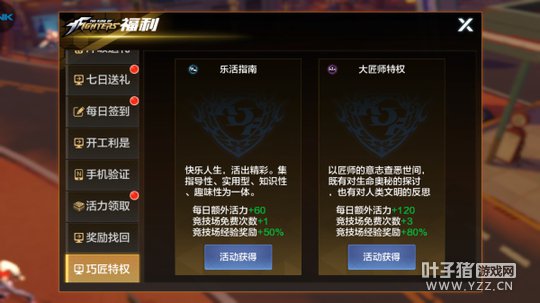活动七:巧匠特权获得尊贵特权 测试期间,可免费获得巧匠特权激活卡,激活后获得尊贵身份,每日可额外获得活力值、竞技场额外调整次数以及竞技场经验加成!