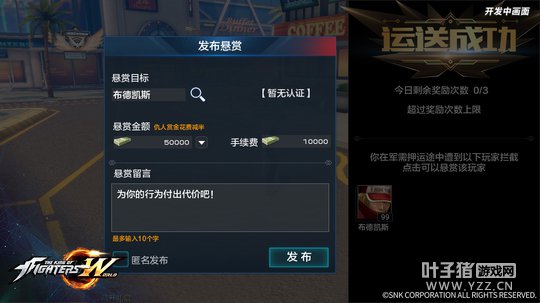 或许你还需要一个八神庵这样的得力帮手 拦截方拦截失败导致押运方成功到达押运终点,押运方除获得奖励外还可以发布悬赏,追击拦截者。