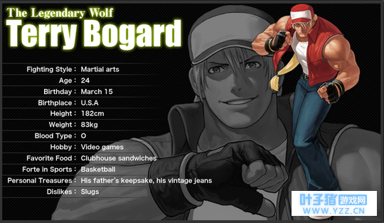 泰利博格的基本信息 在具体介绍他俩之前,首先我要介绍一个在SNK世界里面最为神奇的一个地方叫做:南镇(south town)。这个虚拟的地方,被设定在美国的一个游离于美国政府控制的无主之地,长期被黑恶实力所把持,相关政府机构形同虚设。然而这里是拳手的天堂,黑帮打手,街头拳手,武术道馆比比皆是。相对于KOF里面神魔斗法,拯救世界的背景,南镇的格斗家们更多的是靠着朴实的拳头来生存。很多KOF里面的人物都来自此地或者和南镇有不小的渊源。就提几个著名的:首先当然是南镇大英雄泰利和他的队友东丈,安迪都是来自于南镇,同时安迪的女朋友不知火舞及其家族也和南镇有很大关系,泰利的灵魂伴侣布鲁·玛丽也是来自南镇,当然还有身世最为纠结的泰利的养子南镇第二代大英雄洛克。另外南镇还一直活跃着一个武术道馆就是极限流道馆:阪崎琢磨,坂崎獠,坂崎由莉,罗伯特,以及坂崎獠的灵魂伴侣King姐,他们都是来自南镇的。最后为了匹敌这些大英雄自然还有一帮强力的黑恶势力了,首先是喜欢玩棍子的比利是南镇著名的黑帮打手,KOF95出场的boss队里面的吉斯还有他的弟弟大名鼎鼎的论外帝克劳萨还有MR big也都是南镇的中的一方霸主。。。。