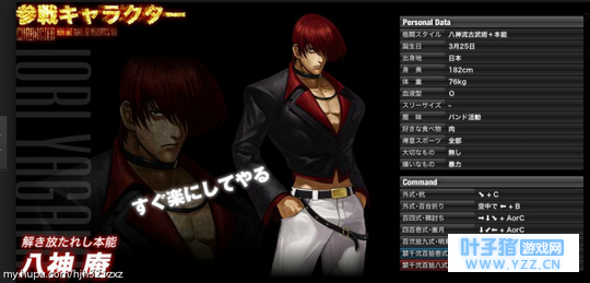 八神庵 出场:95以后的所有版本 八神是本KOF里面最有个性同时也是最为精神分裂的主角。从招式来看,八神的招式稳准狠,嗜血,且不留情面,招式更加偏向邪道武术,而且随时都会变身成暴走八神的可能性,进入狂暴模式,此模式六亲不认,嗜血好杀。。打架基本靠的是战斗本能和家族独创的古武术。相对于其暴戾的打架风格,八神本人的性格做派确实相当的正派,个人讨厌杀戮爱好和平,三观正常,心志坚强。虽然长着一个杀马特造型,但是确实一个文艺青年的格调,而且剧情中可是一个摇滚明星。(音乐上只有射比庵水平更高)对了,对于草剃的谜之执着一直是拳皇的一个迷。(表面或者说早期确实是因为家族仇怨,但是后期原因不明。)以至于在KOF13的开场对话里面,很多人都吐槽过,八神对于京的执着。。。。八神的回复都是:洗内! 八神在拳皇系列的地位其实不必草剃低,95出现以后,一直保持着极高的人气。一直在剧情上扮演核心地位,同时也一直保持着强者的姿态。即使在拳皇13里面已经失去苍炎的力量,依然靠着本身强大格斗能力,吊打一方。而且性能方面一直是强于草薙的。但是剧情上庵就是打不过京。
