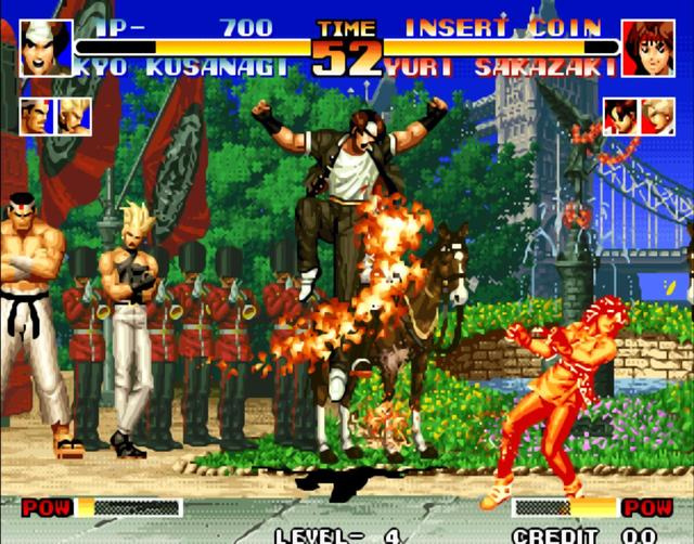 拳皇95 随后两年时间,SNK继续发力,打造了《拳皇》完整的世界观,定义了每个人物的性格、背景故事,期间推出的《拳皇97》让整个系列的人气达到了巅峰,神秘BOSS“大蛇”的引入让游戏充满了传奇色彩,同样廉价的基板使得游戏在全世界广泛流传;而反观《街霸》,虽然在游戏品质上,《街霸3》较前代作品提升不少,但游戏基板高昂的价格,阻碍了IP流通的可能性,所以在国内,听过《拳皇》的小伙伴一定比听过《街霸》的多(《拳皇》的知名度有待考证,但《97》这个名字,一定是大名鼎鼎)。