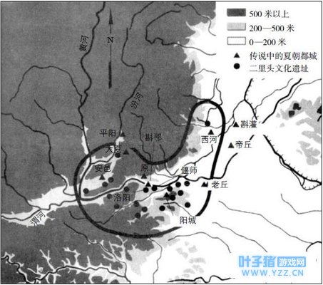 二里头文化的主要遗址及传说中的夏朝都城之所在 三代之间的横的关系, 是了解中国古代国家形成过程的关键 “ 晚近的考古资料使我们对三代史产生一个新的看法,就是从三代关系上看中国古代国家形成的经过。我觉得我们过去对三代古史看法的两个元素,现在要经过根本性的修正。这两个元素,一是对三代的直的继承关系的强调;二是将三代一脉相承的文明发展看做在中国古代野蛮社会里的一个文明孤岛上孤立发展。最近的考古研究使我们对新旧史料重新加以检讨的结果,使我觉得这两个元素是对古史真相了解的重大障碍。夏、商、周三代之间的横的关系,才是了解中国古代国家形成过程的关键。 三代文化与历史在现代考古资料里的地位,可以说是当代中国考古学上最主要的关键问题之一。周代考古历史最久,但西周及伐商以前的周人史料,除了青铜器以外,还很贫乏。商代考古,自1928年中央研究院发掘殷墟以来,已有50年的历史了;这50年间的商代考古可以分为好几个阶段:1928年殷墟发掘为第一期之始,1950年郑州发现商城为第二阶段之始,1959年偃师二里头发掘为第三期之始,1970年山东大汶口文化的发表和长江流域殷商遗址的发现,可说是第四期之始。夏代的考古,尚停留在辨认现有考古资料里有无夏代的阶段。 在仰韶文化发现的初期,曾有人根据仰韶文化分布地域与传说中的夏代活动地域互相重叠,推测过仰韶文化便是夏代文化的考古表现。这个说法,到现在已经不大有人再提了,因为仰韶文化的年代越来越早(最近根据已有的碳14年代的判断是公元前5000年到公元前3000年左右),与夏代的时间不合,而且仰韶文化所代表的社会发展情况也比夏代要原始得多。 将考古学上的文化与历史传说中的文化相印证,最好的证据是文字上的,如殷墟的甲骨文中的王名、世系与人名和《史记·殷本纪》中材料的印证。如果没有文字本身的证据,我们便只好使用时间和空间上的对证。在夏代的活动地理范围之内分布,在时代上可以判定为公元前2000年前后的考古学上的文化,就有当作夏代文化考虑的资格。
