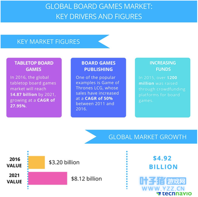 下调预期的全球桌游市场 虽然全球桌游市场提交了一份仍在增长的成绩单,但市场分析却对未来的复合增长率下调了预期和信心。Technavio于今年上半年发布了桌游市场研究报告,全球桌游市场2018年同比增长率为35.3%,全球桌游市场到2022年将达到56.9亿美元。但2018-2022年期间全球桌游市场的复合年增长率为23%,较去年预测的2017-2021年期间内增长率27.9%下降了近5%。 该研究报告涵盖了桌游、卡牌游戏、骰子游戏和角色扮演游戏等类型,其中像Asmodée经营的桌游类型在市场中占63%,报告预测该类型在2022年会下降超过3%。
