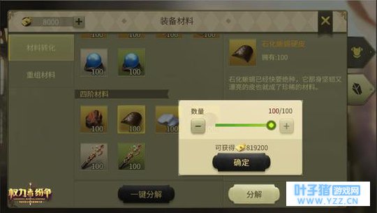 材料转化分为材料分解和材料转化两种方式。材料分解是指将装备材料分解为碎片,不同等级的材料分解后产生的碎片数量也不同。材料转化是指同一类型不同品质的材料之间互相转化,多个低品质材料可以转化成一个高品质材料,一个高品质材料也可以转化成多个低品质材料。