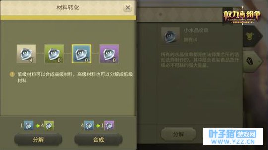 若玩家的套装部件尚未达到金色品质,则需要进行升品操作,将低品质套装部件依次提升至金色品质,然后再将其进阶为更高等级的套装部件! 正如领主装备分为白、绿、蓝、紫、金五种品质,升品材料也分为白、绿、蓝、紫四种,用于对应品质的套装部件升品。其中白色升品材料可以将白色套装部件升至绿色,绿色升品材料可以将绿色套装部件升至蓝色,依次类推直到升为金色,然后再通过进阶材料进化到更高等级套装的白色品质部件。 转化重组,装备材料利用新途径 在《权力与纷争》中,玩家还可以通过材料转化将过量的装备材料分解为材料碎片,再通过材料重组获得欠缺的装备材料,这也为玩家提供了获取更多不同装备材料的途径。