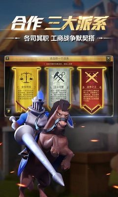 -合作 三大派系,各司其职 工商战争默契搭金钱帝国、工业巨擘、战争之王三大派系,天赋各不相同,不同派系玩家可以相互合作,让效益实现最大化