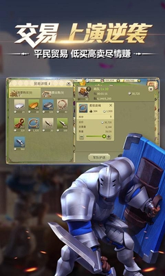 -交易 上演逆袭,平民贸易 低买高卖尽情赚玩家可派出商队,与其他玩家,NPC城堡进行自由贸易,平民玩家可由此获得珍稀装备材料与货币,实现平民逆袭