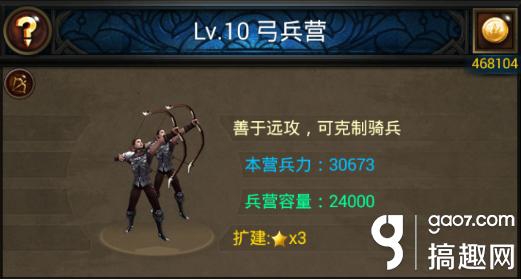 战火纷争的年代,大战一触即发,乱世出英雄,谁可独占鳌头,成就万王之王! 在权力的纷争中,一共有三大兵种,步兵、骑兵、弓兵。可以从兵营中一一产出。 1、步兵,善于防守,克制弓兵。