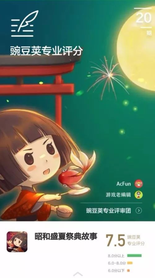 2018就要结束了,今年都有哪些游戏给你留下深刻印象了呢? 第20期豌豆荚专业评分,豌豆荚专业评审团的大神们给《昭和盛夏祭典故事》打出了7.5 的分数。本作延续了“昭和系列”一贯的水准,温馨的剧情,治愈的BGM,没有令人惊叹的设定和玩法,有的只是难以忘怀的夏日祭风景。是2018年不容错过的佳作。 《昭和盛夏祭典故事》综合分:7.5