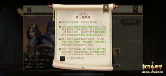 在历经了“国王恩惠”与“联盟崛起”阶段后,法维拉大事纪即将进入全新的“骑士荣耀”阶段!热衷于骑士比武的帝国皇帝古菲尔德二世,为了征召法维拉大陆追逐荣耀的骑士,决定在希瑞嘉德帝国境内举办一场规模浩大的骑士决斗大会! 在决斗期间,来自大陆各地的领主们必须常驻帝国境内,互相战斗比武,驻扎时间越久、胜利场次越多,越能彰显骑士的坚韧与勇武,所获得的荣耀也就越大。而最后,成为法维拉骑士中至高者的领主,将站在巅峰接受所有人的欢呼与赞美! 夺取骑士勋章,赢取惊喜奖励 “骑士荣耀”活动将在“联邦崛起”结束后开始,持续72个小时,各位领主们在活动期间将被受邀迁移到希瑞嘉德帝国境内方可参与。在帝国领土内的玩家,可通过士兵持续布防与击杀他人士兵的方式来获得骑士勋章,并赢得丰厚的道具奖励。 骑士勋章分为个人骑士勋章与联盟骑士勋章两种,在个人骑士勋章获取方面,驻扎希瑞嘉德帝国的玩家,在有城防士兵的情况下,每5分钟就会增加一定数量的骑士勋章,协同他人同样可以获得骑士勋章。 此外,领主们进攻其他玩家,杀死敌人的士兵,则可以掠夺更多的骑士勋章。而防御击杀(包括伤兵)进攻者的士兵,也可以得到一定量的骑士勋章。但需要注意的是,无论是进攻还是防御,都需要玩家在区域内才能获得骑士勋章。