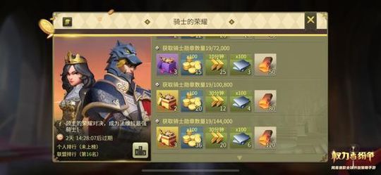 在联盟骑士勋章的获取方面,联盟内所有玩家获得骑士勋章数量都计算到联盟骑士勋章数量。联盟中的领主可在希瑞嘉德帝国区域内,通过进攻强盗和强盗营寨来获得联盟骑士勋章。 同时,在活动期间,联盟成员获得的个人积分和联盟积分记录在成员身上,成员退出联盟将会降低联盟排行积分,新成员加入联盟则会计算新成员带来的积分。因此,若联盟想要取得一个好的排名,就需要招募更多的新成员。 值得一提的是,在活动期间,领主们每天都能获得一个持续一小时的道具加成,该道具将会从每5分钟获得骑士勋章、掠夺他人骑士勋章及消灭强盗与强盗营寨获得的骑士勋章带来高达500%的加成效益!