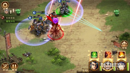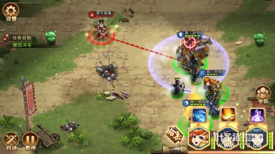 图3弓箭瞄准要快跑 除了铁骑英雄我们还需要面对敌方的神弓英雄,进攻时我们要时刻注意头上出现的准心,一旦发现武将被瞄准,就赶紧操作武将远离战场。只要里的够远,地方就无法攻击到,且瞄准的过程中敌方无法攻击别的单位。没被瞄准的武将就尽情的输出吧。当然,微操时也不要忘了控制战斗范围,因为武将有可能在躲避的过程中吸引更多的敌军。 最终决战