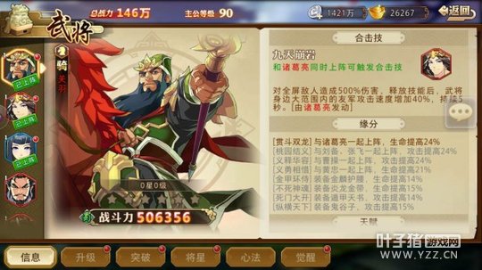 九天崩岩 与诸葛亮同时上阵可触发合体技, 对全屏敌人造成500%,施放技能后,武将身边大范围内的友军攻击速度增加40%,持续5秒。【由诸葛亮发动】 可以看到这个合击带来的伤害不是AOE,是满屏!!!而且还为友军增加攻速,这样的话,带个强弓那还不是爽歪歪。 武将缘分