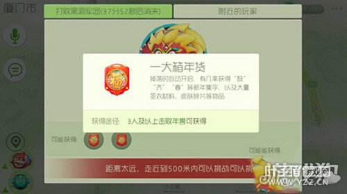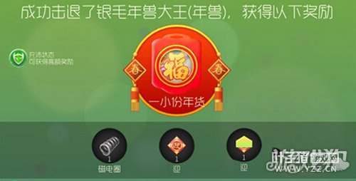 3、另外一种金毛年兽的奖励要更加丰富一些,除了一小份年货外,还有机会获得一大箱年货哦,赶紧拉上小伙伴去挑战吧。