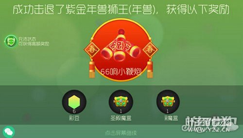 6、击杀年兽狮王可以获得圣衣材料、彩豆、集字以及宝箱等奖励。