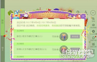 活动任务: 活动期间,参加1局生存模式比赛,可得魔术师的星空礼盒,打开后,可得魔术牌*50,彩豆*20,并有几率获得金蘑菇奖励; 活动期间,获得3次生存模式比赛胜利,可得魔术师的星空礼盒,打开后,可得魔术牌*50,彩豆*30,并有几率获得金蘑菇奖励; 活动期间,完成1场生存模式比赛,且最终至少获得15条生命,可得魔术师的星空礼盒,打开可获得魔术牌*50,火焰龙(残影)4天,并有几率获得金蘑菇奖励; [编辑:叶子猪小秘书]
