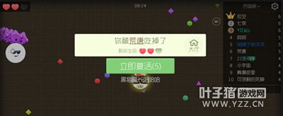 4、当你的球都被吞掉后,可以选择复活,复活后体积回到初始状态,如果你初始三颗心,那就代表你可以死两次。