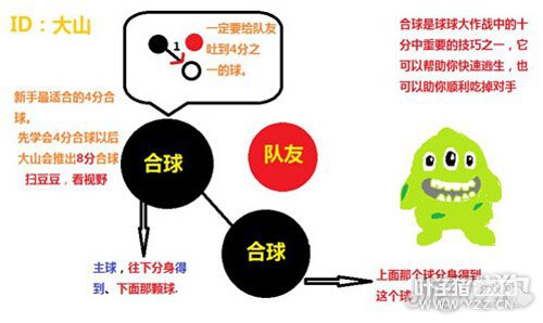 球球大作战团战配合队友合球,合球是比较常见的,那么如何快速四分合球给队友,打出一次漂亮的配合呢,一起来看看大山带来的四分合球图文攻略吧。 合球是球球大作战中十分重要的技巧之一,它可以帮助你快速逃生,也可以助你顺利吃掉对手。下面就是大山给大家的做的攻略图,希望能帮助到球宝们。