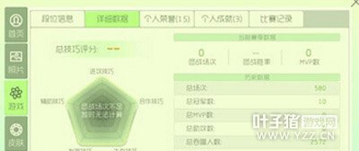详细数据:里面有一张你个人能力的多边形数据图,里面包含的项目有进攻技巧、辅助技巧、合作技巧、发育技巧以及生存技巧,同时还列举了你的历史数据和当前赛季的数据;
