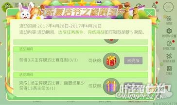 活动详情: 参加1局生存模式比赛:可得雪莉兔的复活节礼物,打开可获得:胡萝卜*80、菜豆*20、并有几率获得金蘑菇奖励 获得3次生存模式比赛胜利:可得雪莉兔的复活节礼物,打开可获得:胡萝卜*80、菜豆*30、并有几率获得金蘑菇奖励 完成1场生存模式比赛,且最终至少获得15条生命:可得雪莉兔的复活节礼物,打开可获得:胡萝卜*80、火焰龙(残影)*4天、并有几率获得金蘑菇奖励 [编辑:叶子猪小秘书]