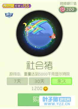 社会猪光环外形看上去室友两只小猪猪在上面跑,后面还有彩虹划出,相当美哦!该光环可以让球宝的show值增加153点!
