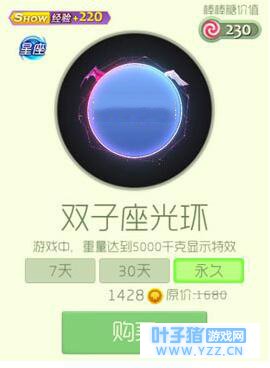 双子座光环外形看上去像星座图,充满双子座的星图!该光环可以让球宝的show值增加220点!