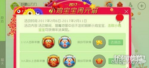 活动三:小鸡宝宝闹元宵 活动时间:2017年2月6日~2017年2月11日 活动内容:活动期间,猎魔地图中会不定时刷新小鸡宝宝,击败小鸡宝宝可获得年货奖励。