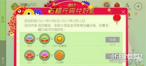 活动二:五福元宵兑好礼 活动时间:2017年2月6日~2017年2月11日 活动内容:活动期间,击败小鸡宝宝可获得五福元宵,收集五福元宵可兑换好礼!