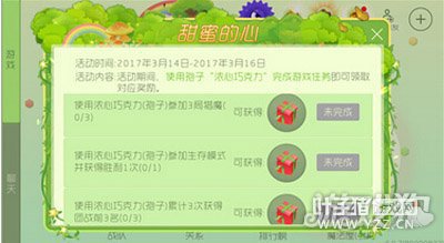 活动时间:2017年3月14日~2017年3月16日 活动内容:活动期间,使用孢子“浓心巧克力”完成游戏任务,即可领对应奖励。 任务详情 1、使用浓心巧克力(孢子)参加3局猎魔,可获得森林春装礼盒一份; 2、使用浓心巧克力(孢子)参加生存模式并获得胜利1次,可获得森林春装礼盒一份; 3、使用浓心巧克力(孢子)累计3次获得团战前3名,可获得森林春装礼盒一份; [编辑:叶子猪小秘书]