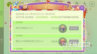 活动时间:2017年4月1日~2017年4月3日 活动内容:活动期间,达成任务条件,完成挑战即可领魔术牌奖励。 活动详情: 活动期间,参加3局团战,可获得魔术师的星空礼盒:打开可获得魔术牌*50,菜豆*20,并有几率获得金蘑菇奖励; 活动期间,累计4次获得团战前三名,可获得魔术师的星空礼盒:打开可获得魔术牌*50,菜豆*30,并有几率获得金蘑菇奖励; 活动期间,累计5次获得团战第一名,可获得魔术师的星空礼盒:打开可获得魔术牌*50,火焰龙(残影)4天,并有几率获得金蘑菇奖励; [编辑:叶子猪小秘书]