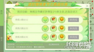 挑战目标:单局生存模式获得至少9条生命,打指定场次。 完成1场,获得20个彩豆,1份神秘美食,10个金蘑菇; 完成2场,获得20个彩豆,1份神秘美食,10个金蘑菇; 完成3场,获得20个彩豆,1份神秘美食,10个金蘑菇; [编辑:叶子猪小秘书]