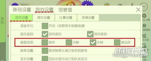 2、另一个新的更新是画质配置,点击账号&设置; 3、在游戏设置——游戏设置下,可以看到多出了一个画面品质,在这里可以对画面进行画质修改,有小伙伴可能要问了,几个球一个黑板的画面有什么影响吗?当然有,那些皮肤圣衣特效对你的机子性能还是有一定要求的,包括一些主题也加了大量特效,所以在保证不卡的前提下,可以在画面效果上进行更多选择。