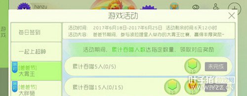 球球大作战爸爸节活动介绍,三大活动送好礼。爸爸节活动也悄然上线了。虽然形式和以往一样,但是我们还是一起来看看爸爸节都可以参加哪些活动吧。 这次爸爸节为球宝们提供了三个活动玩法,具体内容和之前的几次活动都差不多,点击大厅上方的精彩活动就可以进入活动列表,蓝色标签的就是爸爸节活动啦。 1 、大胃王(活动时间2017年6月18日-6月25日) 活动期间累计吞噬一定数量的玩家,即可兑换对应奖励。