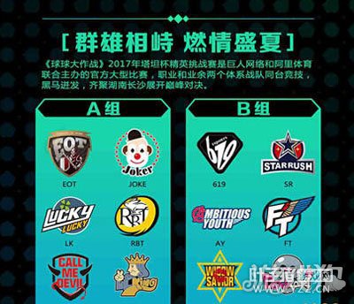 【群雄相峙 燃情盛夏】 做为大型杯赛,2017《球球大作战》塔坦杯精英挑战赛汇聚国内两大体系(职业联赛&赛事积分)12支顶尖战队。既有2017BPL春季赛冠军619、明星战队Joke、AY、EOT、LK等老牌劲旅,也有在《球球大作战》赛事积分体系中排名靠前的DZ、SR、RBT、VLK等后起之秀。职业和业余两大体系中实力顶尖的战队同场竞技,黑马迸发。在为期两天的比赛中为观众球宝们献上高水平紧张激烈的比赛。