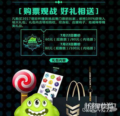 【购票观战 好礼相送】 凡亲临2017《球球大作战》塔坦杯精英挑战赛现场的玩家,都将100%获得入场大礼包。礼包内含塔坦抱枕、纹身贴、应援哨子、助威棒等精美礼品。此外还有神秘嘉宾加盟,献上精彩表演。