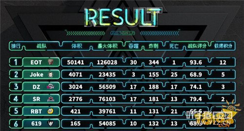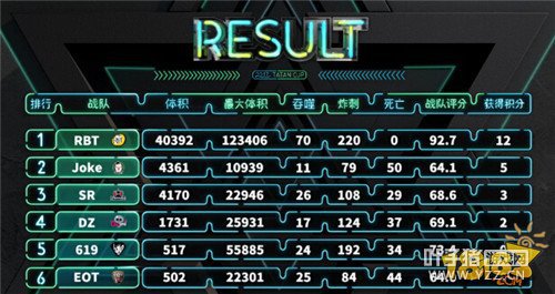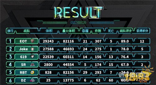 胜者组BO5第五局 最后一局,前期经过一段时间混战,大家你来我往,相互试探后,RBT和EOT交替领先,双方积分达到1W。4分钟DZ又灭掉了被四处压制的619,暂居第三。前三积分不分上下。但1分钟后JOK收DZ排名第二,相差第一名RBT5000积分。而RBT三线发展最终获得第一,真的是今年的大黑马呀。本局MVP是RBT战队Yogurt