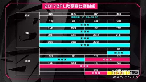 由巨人网络和阿里体育联合主办的2017年《球球大作战》BPL职业联赛(秋季赛)即将于9月7日-10月22日在上海星球影棚敲响战鼓!本届BPL秋季赛比赛日为每周周四-周日四天,上海星球影棚等你来搞事情! (目前本露菲菲只搞到这么多消息,舔着冰棍儿负责的说福利神马的铁实诚了!) 赛程赛制优化 战火硝烟升级 2017BPL秋季赛分为三个阶段:常规赛、季后赛以及保级赛。