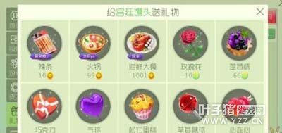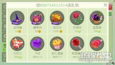 在送礼界面中可以看到,巫师帽需要10个金蘑菇,糖果袋需要99个金蘑菇,南瓜车需要1001个金蘑菇,我们点击就可以送给好友了。