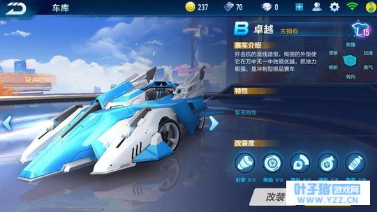 B类车剃刀虽然拥有超流线型的车身设计,车尾拥有两个导弹,给人一种加速超群的感觉。巧的车身能够让剃刀通过狭窄的小道,且车辆比较耐撞击,在比赛中较为稳定。但是车辆本身的直线速度、集气能力不足,所以在改装时要注意这两点的补充。所以改进引擎先让赛车的速度有提升、再改装氮气提升集气能力,之后再慢慢升级其他属性是比较好的策略。 卓越