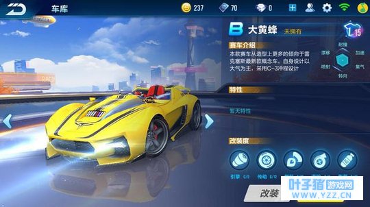卓越的车头看起来很像飞机,这种设定使得赛车在冲刺时有了很好的表现。对于卓越而言,在改装时需要重点关注的是他的引擎和燃料,引擎可以提升车辆的直线速度,而燃料可以让加速的时间更长。这样这款卓越的赛车就更加如虎添翼了! 大黄蜂