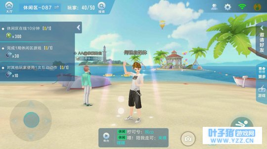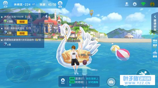 除此之外,休闲区中还有很多供玩家们互动的道具,例如沙滩椅子、小黄鸭、秋千和天鹅。如上图,小编才体验了一会儿坐天鹅的感觉,就有一男一女游过来“踩场子”了。作为一名单身汉,我实在是忍受不住她们之间的恩爱,于是我只好让给她们了,她们也跳起了“尬舞”表示开心。 那什么是“尬舞”呢?如下图所示,在聊天区域右边有一个“动作”按键,玩家们可以在里面选择各种各样的动作,以用于玩家之间的互动弄,“尬舞”是其中一种很受欢迎、十分有趣的互动动作。另外,玩家们还可以选用膜拜、送鲜花、干杯等各种有意思的动作。
