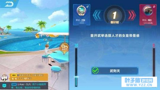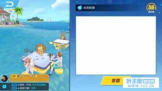 除了你画我猜之外还有另外一个小游戏,他就是答题大赛,答题大赛是在泳池旁边。你可以跟其他路人玩家进行PK,这时候就需要考验你的文凭了,系统会随机出题,每道题限时为10秒钟,规定时间内猜出答案。答对的越多你能能量条就会越高,这样就可以击败路人玩家。